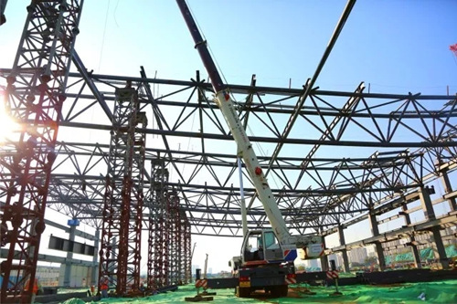 四號(hào)展館屋面桁架吊裝在進(jìn)行中。