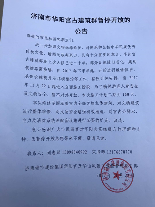 11月22日,因華陽宮古建筑群部分設施陳舊老化,建構(gòu)筑物急需修繕,即日起進入全面施工修復階段。濟南城市建設集團華陽宮及華山風景區(qū)建設管理項目部發(fā)布濟南市華陽宮古建筑群暫停開放的公告。