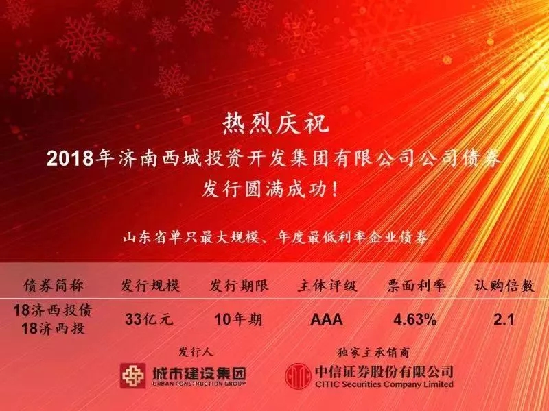 12月14日,濟(jì)南城市建設(shè)集團(tuán)全資子公司濟(jì)南西城投資開發(fā)集團(tuán)有限公司成功發(fā)行33億元企業(yè)債券,共有53家機(jī)構(gòu)參與認(rèn)購,認(rèn)購倍數(shù)2.1倍,認(rèn)購總額達(dá)到70億元,發(fā)行利率4.63%,期限10年。該筆企業(yè)債券創(chuàng)下多項(xiàng)省市企業(yè)債券發(fā)行之最,是我省2018年規(guī)模最大、本年度利率最低的企業(yè)債券,同時(shí)該筆債券融資也是濟(jì)南市有史以來獲批最大規(guī)模、今年唯一一筆企業(yè)債券。