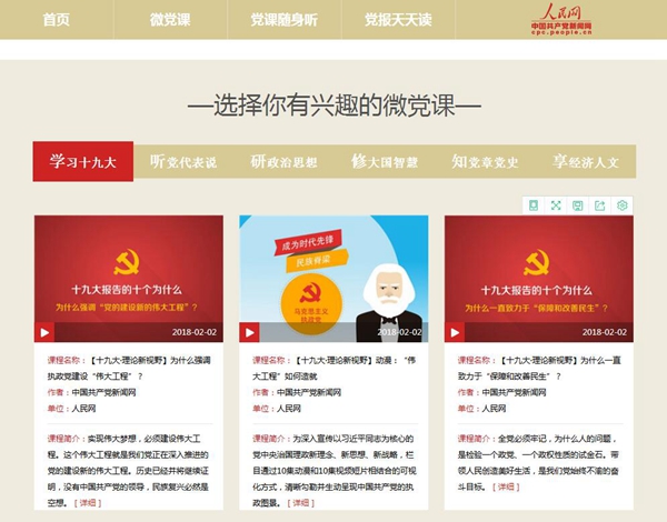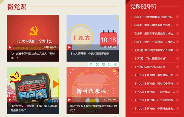《十九大報告的十個為什么》、《社會主義有點潮》、《給90后講講馬克思》、《馬克思是對的》、《我是共產(chǎn)黨員》……“云黨課”學(xué)習(xí)平臺目前重點收錄了十九大精神系列解讀、最新最潮的系列微視頻、以及我黨十八大以來的黨建工作、治國理政等相關(guān)黨課學(xué)習(xí)視頻課程共計200余部,涵蓋黨建、政治、經(jīng)濟(jì)、文化、社會、外交等各個領(lǐng)域。平臺主要分為三大板塊:微黨課、黨課隨身聽、黨報天天讀,兼容PC端與手機(jī)端,方便廣大黨員干部及群眾多視角、多形式學(xué)習(xí)黨課內(nèi)容。
