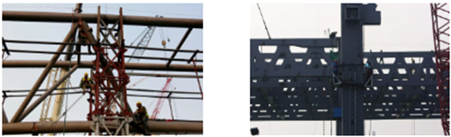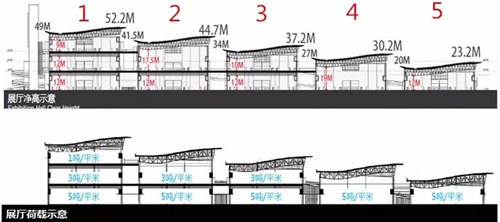 在施工現(xiàn)場(chǎng),五個(gè)展館的整體結(jié)構(gòu)已經(jīng)非常清晰,從南至北兩座一層展館,兩座雙層展館,一座三層展館錯(cuò)落有致地排列著,其中整體高度最高的為最北端的1號(hào)展館,三層總高度52.2米,單層最高的為4號(hào)展館,高度30.2米(凈高度19米),適合舉辦大型機(jī)械類展會(huì)。
