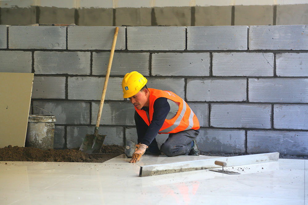 工人在室內(nèi)鋪設(shè)地面瓷磚