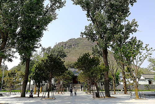 在綠地廣場(chǎng)面向一宮門,右側(cè)可以看到臥牛山的全貌,正面對(duì)視華山。兩側(cè)綠地每側(cè)精選了7棵造型油松,因?yàn)槿A陽(yáng)宮道家文化的元素多些,此處也有北斗七星的意境。二是采用了借景、點(diǎn)景、框景的園林手法,借一宮門為背景,點(diǎn)造型松為景物,框出清晰的山體輪廓的畫面。