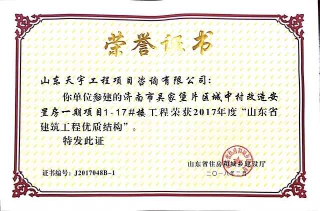 質量是企業(yè)的生命。在山東省住房和城鄉(xiāng)建設廳組織的2017年度“山東省建筑工程優(yōu)質結構”評審中,吳家堡片區(qū)安置房一期工程1#到17#樓(共計17棟樓),憑借過硬的質量、完善的管理順利通過專家考評,喜獲“山東省建筑工程優(yōu)質結構”。“山東省建筑工程優(yōu)質結構”代表著全省各建筑企業(yè)施工質量管理的領先水平,為沖刺山東省建筑工程質量最高榮譽“泰山杯”奠定了基礎。