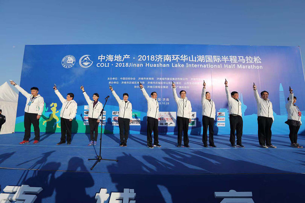 10月28日上午8點,中海地產(chǎn)·2018濟南環(huán)華山湖國際半程馬拉松在濟南華山腳下鳴槍開跑。來自24個省區(qū)市的5000余名跑友以及13名國外選手參賽。山東省體育局局長李政,濟南市委常委、宣傳部部長楊峰,副市長王桂英,歷城區(qū)委書記吳承丙,濟南日報報業(yè)集團董事長馬利,濟南市體育局局長高立文,濟南廣播電視臺臺長孫世會,濟南城市建設(shè)集團董事長李國祥等出席開幕式并為開賽鳴槍。