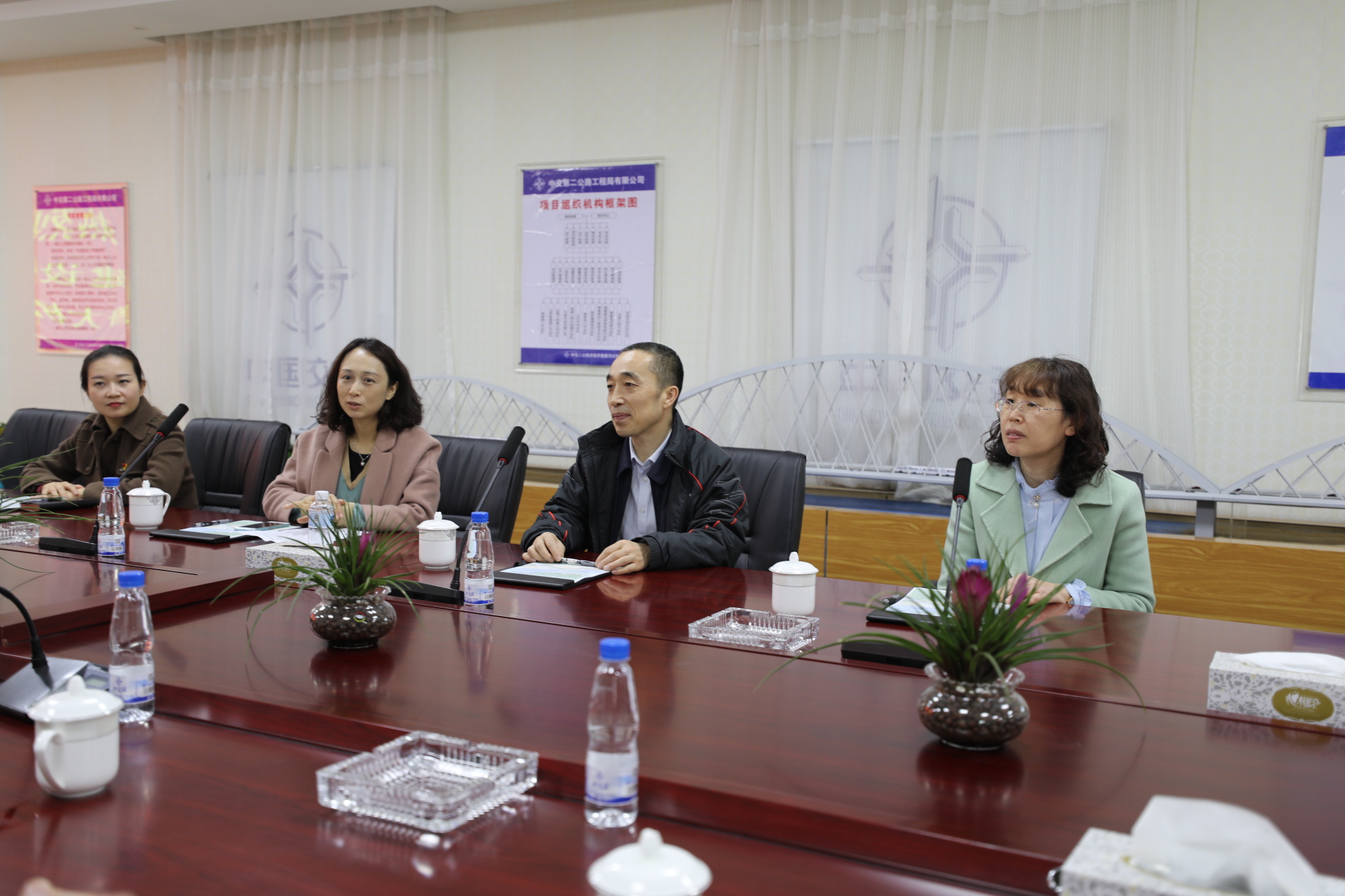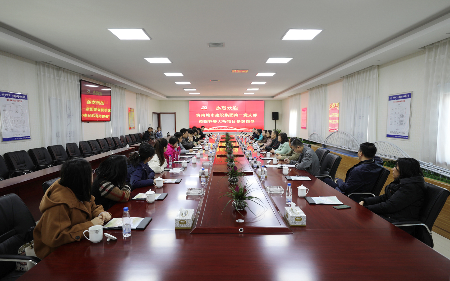 全體人員在集團(tuán)總會(huì)計(jì)師范天云的帶領(lǐng)下,首先來(lái)到齊魯大道北延工程項(xiàng)目經(jīng)理部,與公司副總經(jīng)理趙世超及工作人員進(jìn)行了座談,雙方首先介紹了各自支部情況及組織建設(shè)情況并進(jìn)行了交流。隨后,項(xiàng)目負(fù)責(zé)人對(duì)工程進(jìn)行了詳細(xì)的介紹,并參觀了齊魯黃河大橋橋梁模型、觀看了黃河大橋建設(shè)宣傳片,展示了齊魯黃河大橋的建設(shè)過(guò)程及原理。作為目前同類橋型跨徑世界第一網(wǎng)狀吊桿系桿拱橋,其所展現(xiàn)的創(chuàng)新技術(shù)、建成效果以及打造的“黃河橋梁文化”令人驚嘆和期待。