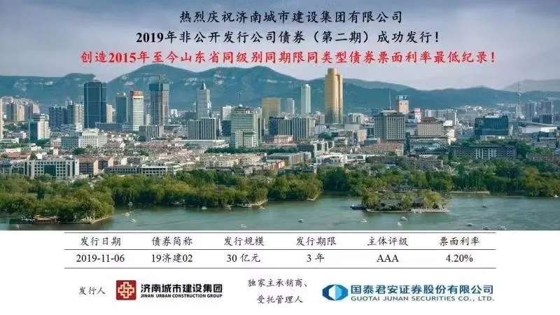 2019年11月6日,濟(jì)南城市建設(shè)集團(tuán)非公開發(fā)行2019年公司債券(第二期)(“19濟(jì)建02”)發(fā)行圓滿落地,創(chuàng)造2015年至今山東省同級別同期限同類型債券票面利率最低紀(jì)錄。本期債券發(fā)行得到了市場的廣泛認(rèn)可,投資者認(rèn)購踴躍。19濟(jì)建02低利率發(fā)行,充分展現(xiàn)了投資者對建設(shè)集團(tuán)領(lǐng)先的行業(yè)地位、良好的品牌形象以及穩(wěn)健的財(cái)務(wù)政策等方面的肯定。