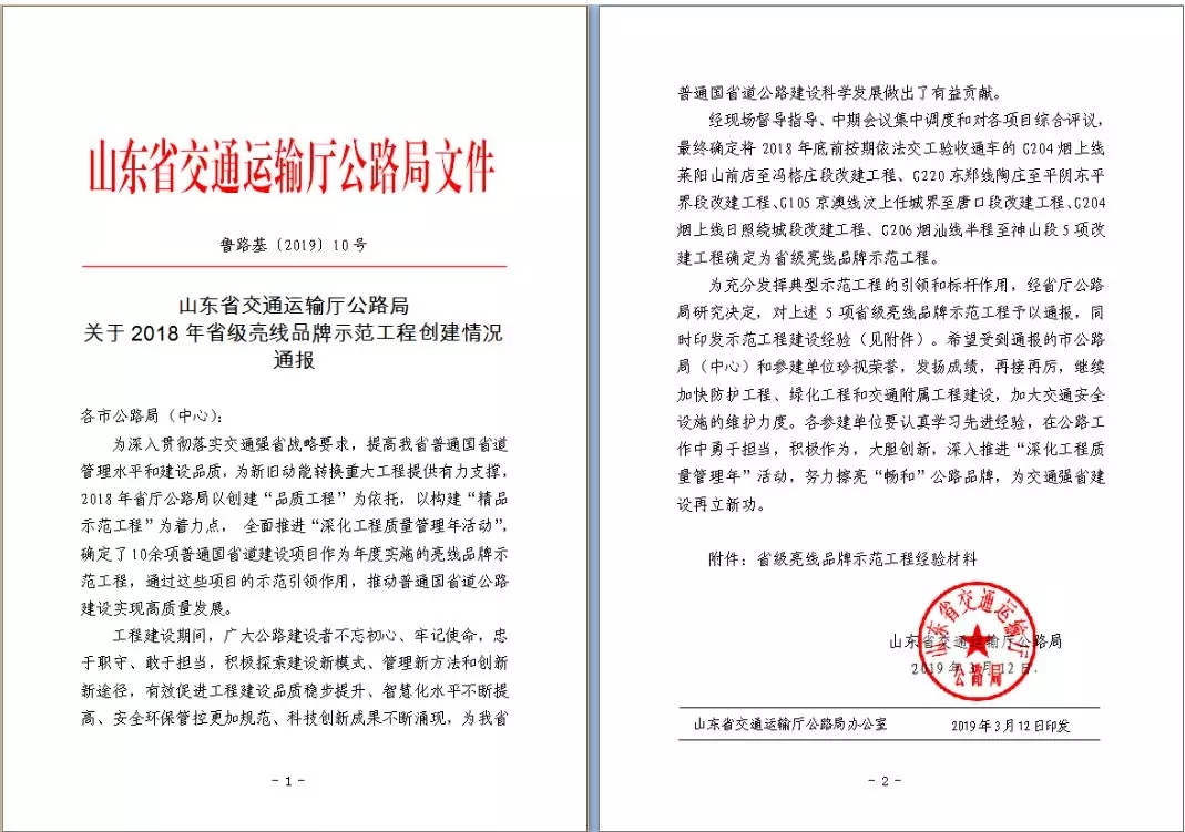 由濟(jì)南城市建設(shè)集團(tuán)所屬金諾公司負(fù)責(zé)代建管理、金衢公司負(fù)責(zé)設(shè)計(jì)、金曰等公司參與建設(shè)的G220東鄭線陶莊至平陰東平界段改建工程(簡(jiǎn)稱“G220平陰南段改建工程”)喜獲山東省交通運(yùn)輸廳公路局“2018年省級(jí)亮線品牌示范工程”榮譽(yù)稱號(hào)。