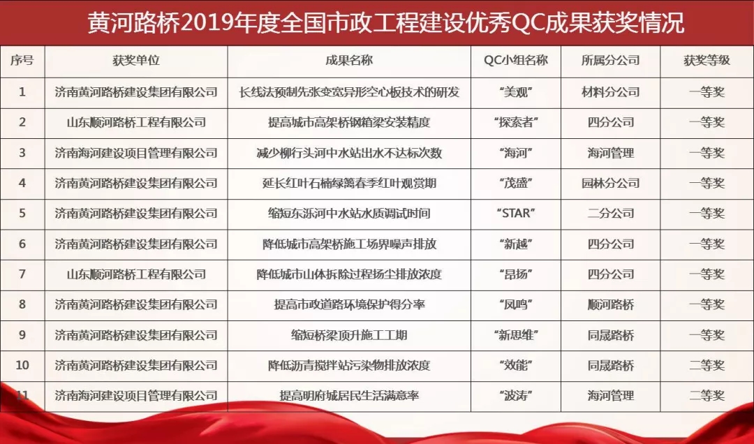 濟(jì)南黃河路橋建設(shè)集團(tuán)有限公司共有11項成果參與發(fā)布,其中9項成果榮獲一等獎,2項成果榮獲二等獎;同時黃河路橋建設(shè)集團(tuán)被評為2019年“全國市政工程建設(shè)QC小組活動優(yōu)秀企業(yè)”,這是自2013年以來連續(xù)七年獲得此項殊榮。