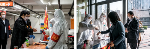 在西城大廈,從車庫(kù)電梯入口到一樓入口,身穿防護(hù)服的工作人員手拿測(cè)溫槍,對(duì)進(jìn)入人員進(jìn)行第一關(guān)檢驗(yàn),隨后查驗(yàn)身份證通行證、身份登記、問詢、消毒,一系列流程一氣呵成,建立起防疫安全的第一道防線。