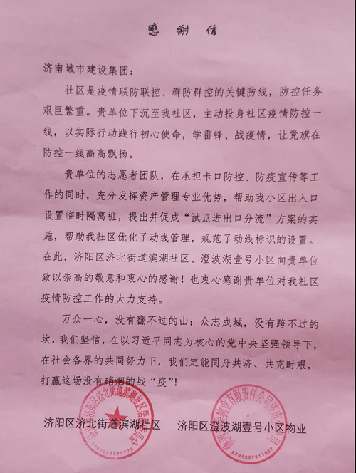 4月20日下午,在集團(tuán)第十一批下沉社區(qū)疫情防控服務(wù)隊(duì)即將完成執(zhí)勤任務(wù)之時(shí),濟(jì)陽、濟(jì)北街道社區(qū)將四面錦旗和一封飽含深情的感謝信送到志愿者手中,表達(dá)對(duì)濟(jì)陽、濟(jì)北小組志愿者的感謝與認(rèn)可。