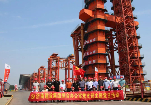 在鳳凰黃河大橋,項目負(fù)責(zé)人對鋼塔、鋼箱梁頂推和跨堤引橋施工以及安全、質(zhì)量、進(jìn)度、環(huán)保和疫情防控等情況進(jìn)行了介紹,支部成員進(jìn)行了現(xiàn)場參觀。