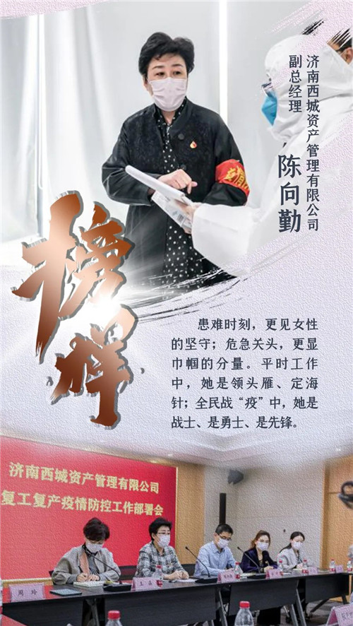 患難時(shí)刻,更見女性的堅(jiān)守;危急關(guān)頭,更顯巾幗的分量。平時(shí)工作中,她是領(lǐng)頭雁、定海針;全民戰(zhàn)“疫”中,她是戰(zhàn)士、是勇士、是先鋒。作為200多萬平方國有資產(chǎn)的“守護(hù)者”,陳向勤一直堅(jiān)守在資產(chǎn)管理一線,制定并落實(shí)防控預(yù)案及標(biāo)準(zhǔn)化操作,部署建立三級(jí)防控體系,為國有資產(chǎn)疫情防控樹立了新標(biāo)桿。她帶動(dòng)西城資產(chǎn)人同心戰(zhàn)“疫”,筑起一道守護(hù)國有資產(chǎn)安全的鋼鐵防線。