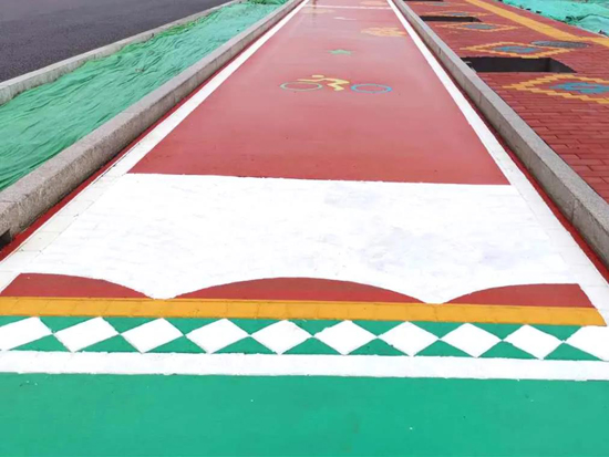 此次創(chuàng)新將SP彩色壓花、熒光瀝青路面工藝在慢車道上進(jìn)行試驗(yàn),施工時選用紅、綠、藍(lán)三種基礎(chǔ)顏色分段進(jìn)行。通過噴涂SP專用涂料,改變?yōu)r青面層顏色,不但提高了道路辨識度,同時能夠在無分隔帶道路中明確機(jī)非車道界限,有利于規(guī)范非機(jī)動車規(guī)范行車,降低事故發(fā)生概率。