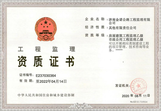 8月11日,經(jīng)山東省住房和城鄉(xiāng)建設(shè)廳批準(zhǔn),濟(jì)南金諾公路工程監(jiān)理有限公司成功取得房屋建筑工程監(jiān)理乙級(jí)資質(zhì)。