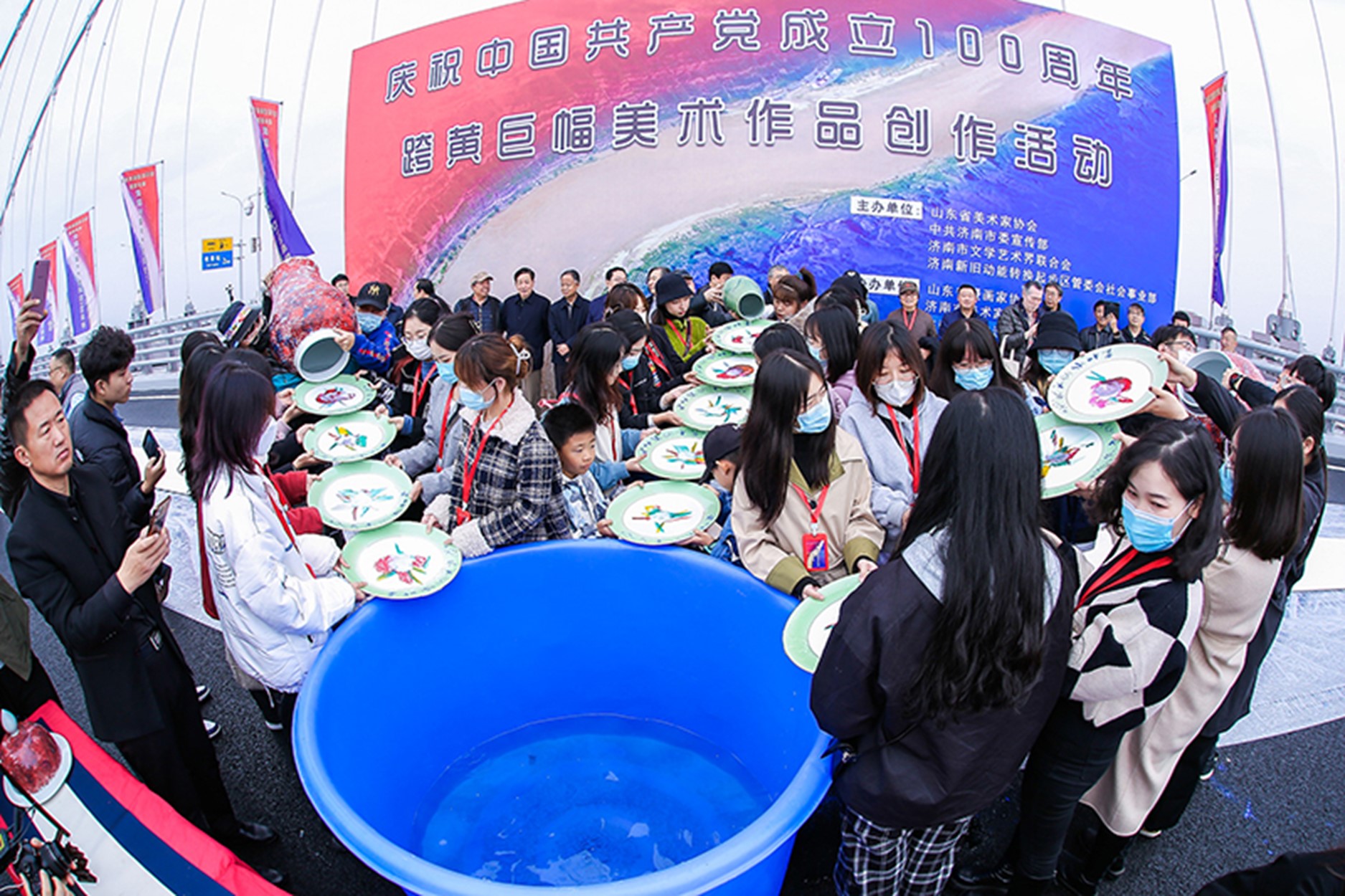 為助力黃河重大國家戰(zhàn)略實(shí)施,在新時(shí)代現(xiàn)代化強(qiáng)省會建設(shè)和服務(wù)全市改革發(fā)展大局中彰顯文化擔(dān)當(dāng),11月6日,山東省美術(shù)家協(xié)會、中共濟(jì)南市委宣傳部、濟(jì)南市文學(xué)藝術(shù)界聯(lián)合會、濟(jì)南新舊動(dòng)能轉(zhuǎn)換起步區(qū)管委會社會事業(yè)部在濟(jì)南鳳凰黃河大橋聯(lián)合組織舉辦慶祝中國共產(chǎn)黨成立100周年跨黃巨幅美術(shù)作品創(chuàng)作活動(dòng)。活動(dòng)旨在進(jìn)一步保護(hù)、傳承和弘揚(yáng)黃河文化,深入挖掘黃河文化的時(shí)代價(jià)值,以優(yōu)秀的藝術(shù)作品記錄新時(shí)代、謳歌新時(shí)代,為“文化濟(jì)南”建設(shè)貢獻(xiàn)文藝力量。