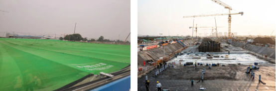 隨著思想上的轉(zhuǎn)變,辛崇升更是帶來了行動上的創(chuàng)新。在他的帶領(lǐng)下,黃河大道項目部在全市率先應(yīng)用新型揚塵治理技術(shù)——防塵天幕,通過鋼立柱、鋼絲繩、電機以及防塵網(wǎng)組“天幕”體系,有效解決了施工和環(huán)保的矛盾。