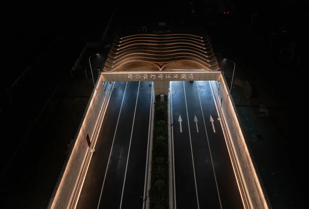 保持隧道主體工程結(jié)構(gòu)不變,通過增加裝飾,實(shí)現(xiàn)整體設(shè)計(jì)提升。隧道南北出口聲屏障以“歲歲九曲彎”和“歲歲安瀾”為設(shè)計(jì)主題,以中國傳統(tǒng)裝飾紋樣呈現(xiàn),夜晚還將呈現(xiàn)“日出黃河”的燈光效果。添加“流動(dòng)”與“水紋”的造型體現(xiàn)了黃河穿越之美,在隧道內(nèi)采用3D打印貼膜工藝?yán)L制白楊樹(寓意堅(jiān)韌、表達(dá)力求上進(jìn)的精神),以緩解駕駛員視覺疲勞。同時(shí)以黃河星空為題,中間段頂部弧線的燈光表現(xiàn)黃河穿越之感,暖色照明設(shè)計(jì)表現(xiàn),感受黃河星空光線流動(dòng)之美。