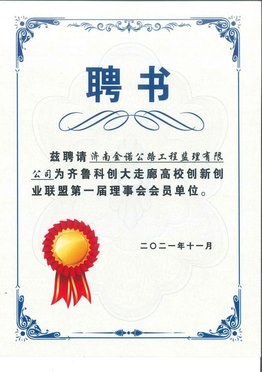 近日,齊魯科創(chuàng)大走廊高校創(chuàng)新創(chuàng)業(yè)聯(lián)盟成立大會在山東青年政治學(xué)院召開,濟南金諾公路工程監(jiān)理有限公司當(dāng)選為第一屆理事會會員單位。