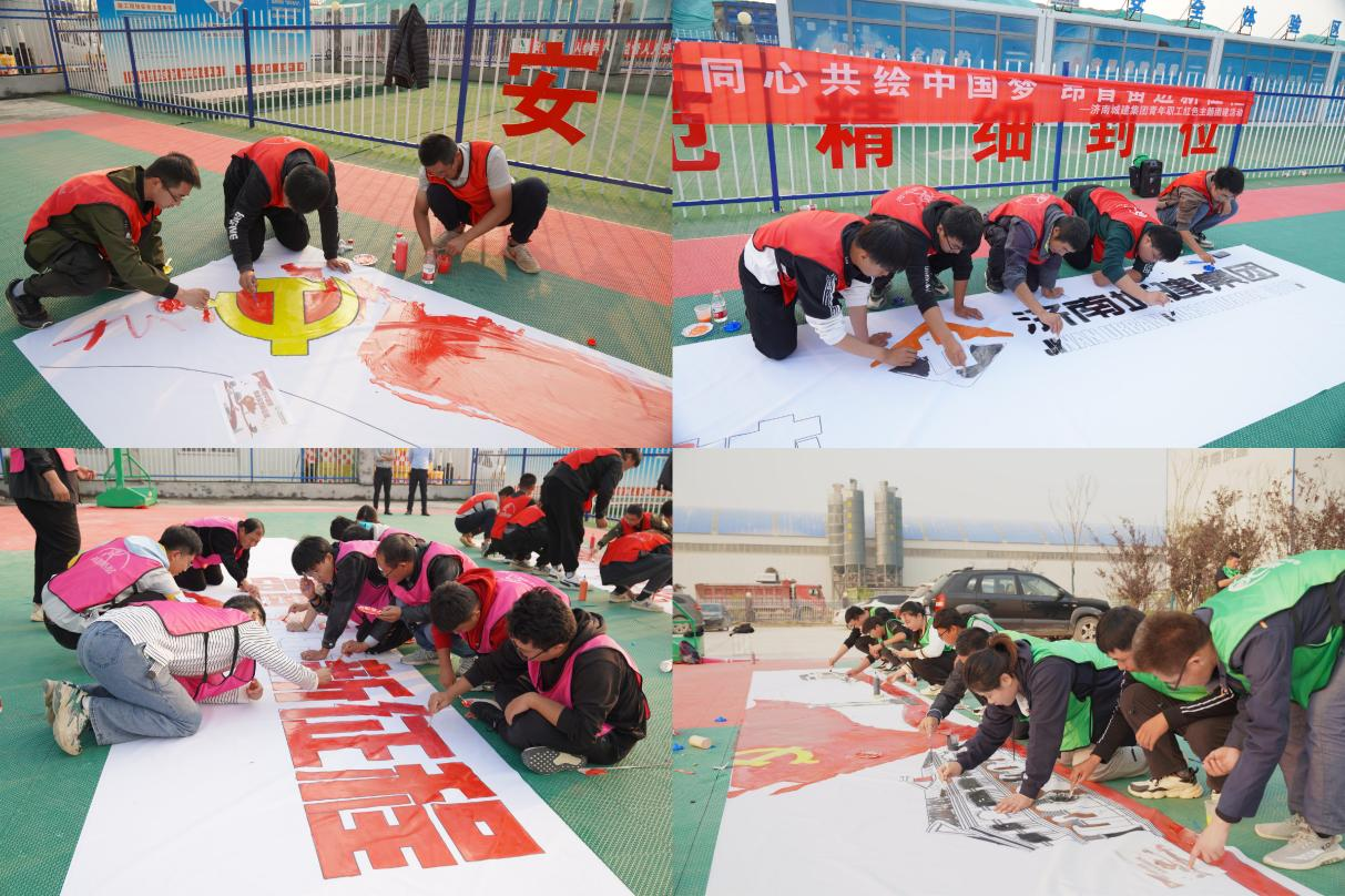 伴隨著激昂的團(tuán)歌,白色畫(huà)卷在地上一字鋪開(kāi),青年職工們手拿畫(huà)筆圍在兩側(cè),用五彩斑斕的顏料繪制起波瀾壯闊的畫(huà)卷,一筆一畫(huà)深情地表達(dá)出對(duì)黨和國(guó)家的美好祝愿。每個(gè)線(xiàn)條都蘊(yùn)藏著青年職工永遠(yuǎn)跟黨走、筑夢(mèng)新時(shí)代的堅(jiān)定信念。