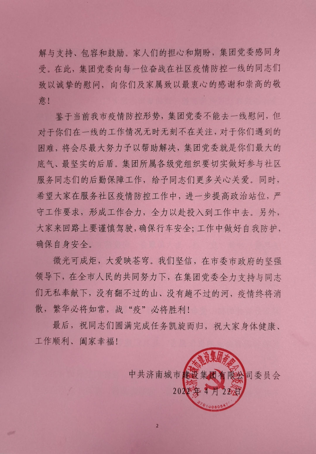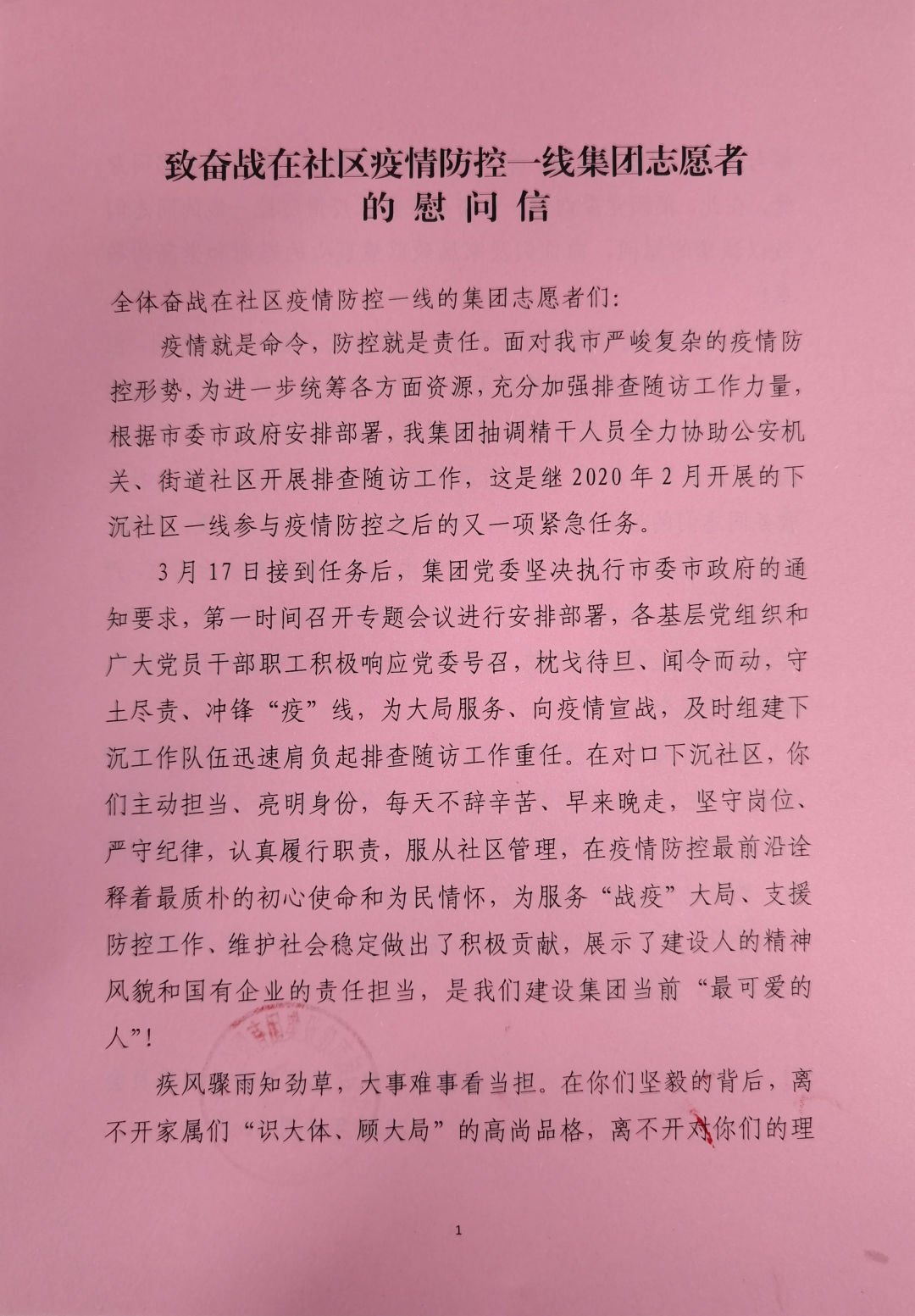 鑒于當(dāng)前我市疫情防控形勢,集團黨委不能去一線慰問,但對于你們在一線的工作情況無時無刻不在關(guān)注,對于你們遇到的困難,將會盡最大努力予以幫助解決,集團黨委就是你們最大的底氣、最堅實的后盾。集團所屬各級黨組織要切實做好參與社區(qū)服務(wù)同志們的后勤保障工作,給予同志們更多關(guān)心關(guān)愛。同時,希望大家在服務(wù)社區(qū)疫情防控工作中,進一步提高政治站位,嚴(yán)守工作要求,形成工作合力,全力以赴投入到工作中去。另外,大家來回路上要謹(jǐn)慎駕駛,確保行車安全;工作中做好自我防護,確保自身安全。