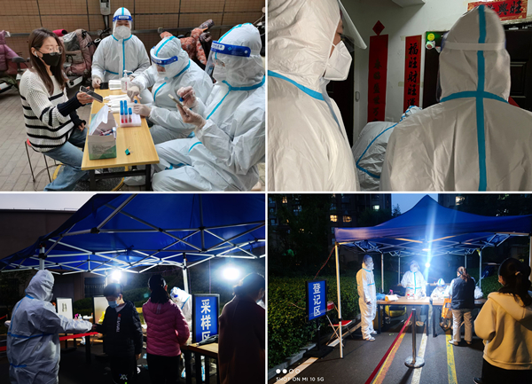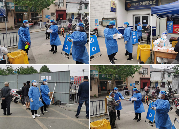 在石橋社區(qū),身著藍色工作服的青年突擊隊志愿者分工明確、相互配合,穿梭忙碌在核酸采樣現(xiàn)場:協(xié)助檢測、體溫測量、有序引導(dǎo)、登記信息、維持秩序、耐心講解。盡管現(xiàn)場下起了小雨,志愿者們冒雨作戰(zhàn),保持采樣工作有條不紊、順利推進,在規(guī)定時間內(nèi)圓滿完成社區(qū)采樣任務(wù),為石橋社區(qū)繪出一片堅實的守衛(wèi)藍。