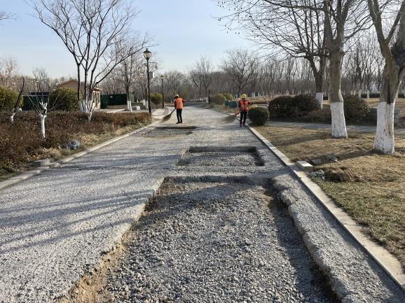 針對市民反映的補修華山湖北岸部分道路的訴求,集團高度重視,工程二部相關(guān)工作人員立即到現(xiàn)場實地勘察,組織編制整修方案,確定將上部松散面層銑刨后,更換為瀝青面層,并于2月28日進場實施??茖W組織,加強調(diào)度,在保護公園環(huán)境及周邊既有設(shè)施不遭破壞的基礎(chǔ)上,于3月25日施工完成,比預(yù)計時間提前一周。