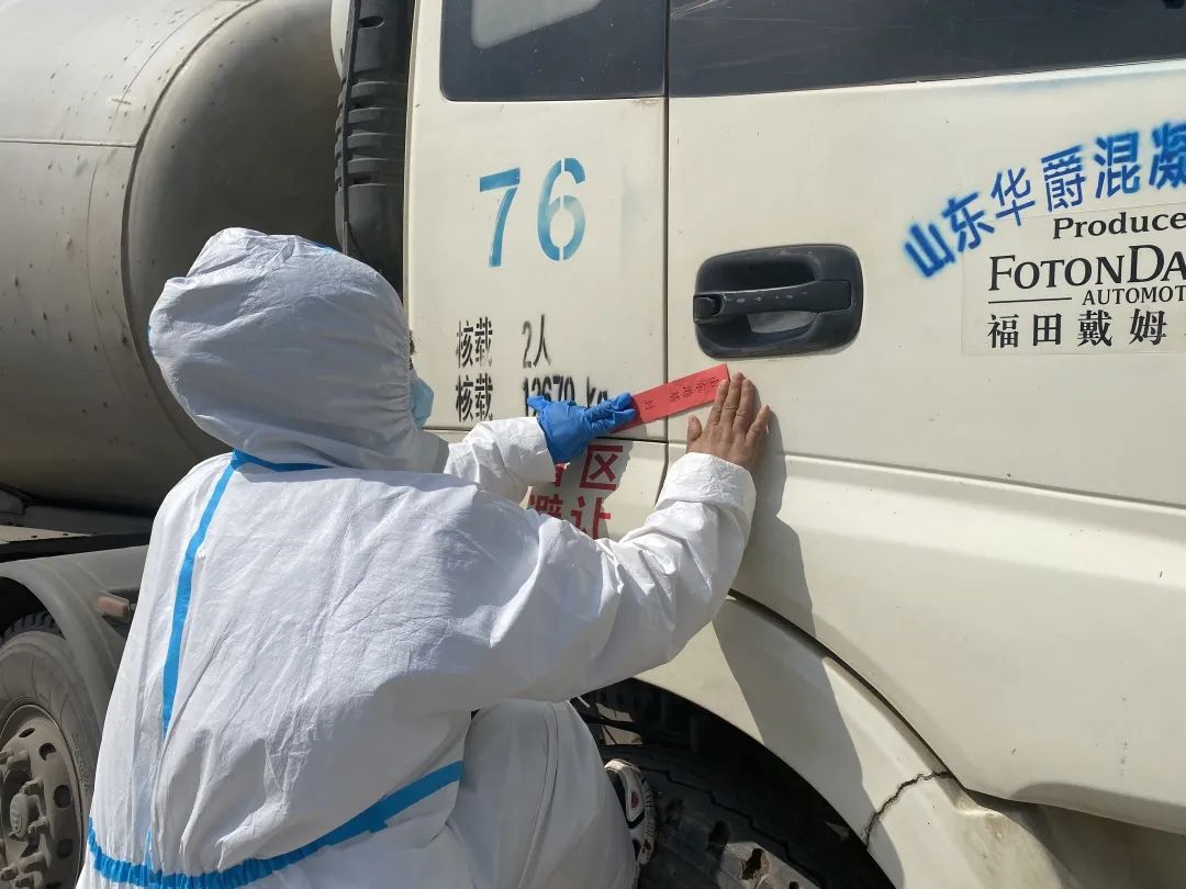 目前的建設(shè)階段,施工現(xiàn)場(chǎng)必須有鋼筋、混凝土的持續(xù)供應(yīng)。工地設(shè)置了材料進(jìn)場(chǎng)專用過渡區(qū),對(duì)材料進(jìn)行防疫消殺后才能進(jìn)入現(xiàn)場(chǎng)使用。在封閉區(qū)門口,記者看到,兩輛混凝土攪拌車正準(zhǔn)備進(jìn)入現(xiàn)場(chǎng)作業(yè)。管理人員在進(jìn)行必要的信息查驗(yàn)登記后,在車門貼上封條,對(duì)車體消殺之后,攪拌車順利進(jìn)入了現(xiàn)場(chǎng)施工。宋丹生介紹,貼封條、禁止司機(jī)下車,可最大限度避免施工人員與外界的接觸。