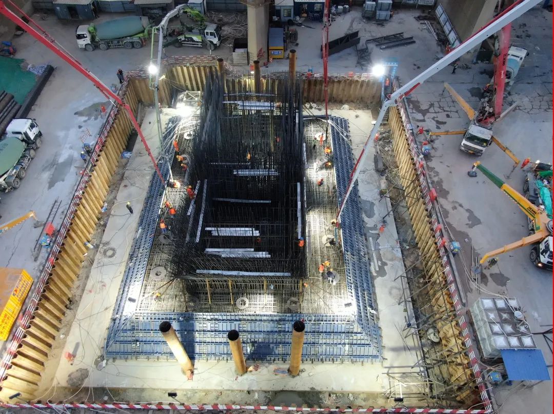 目前,水庫南岸暗埋段第九流水段腳手架搭設(shè)完成30%,第十流水段頂板混凝土澆筑完成100%;第十三流水段負(fù)三層側(cè)墻鋼筋綁扎完成100%,中隔墻施工完成50%,腳手架搭設(shè)完成75%;第十四流水段第五道鋼支撐拆除完成90%;第十五流水段底板混凝土澆筑完成75%。同時,管片預(yù)制也在同步生產(chǎn)中。