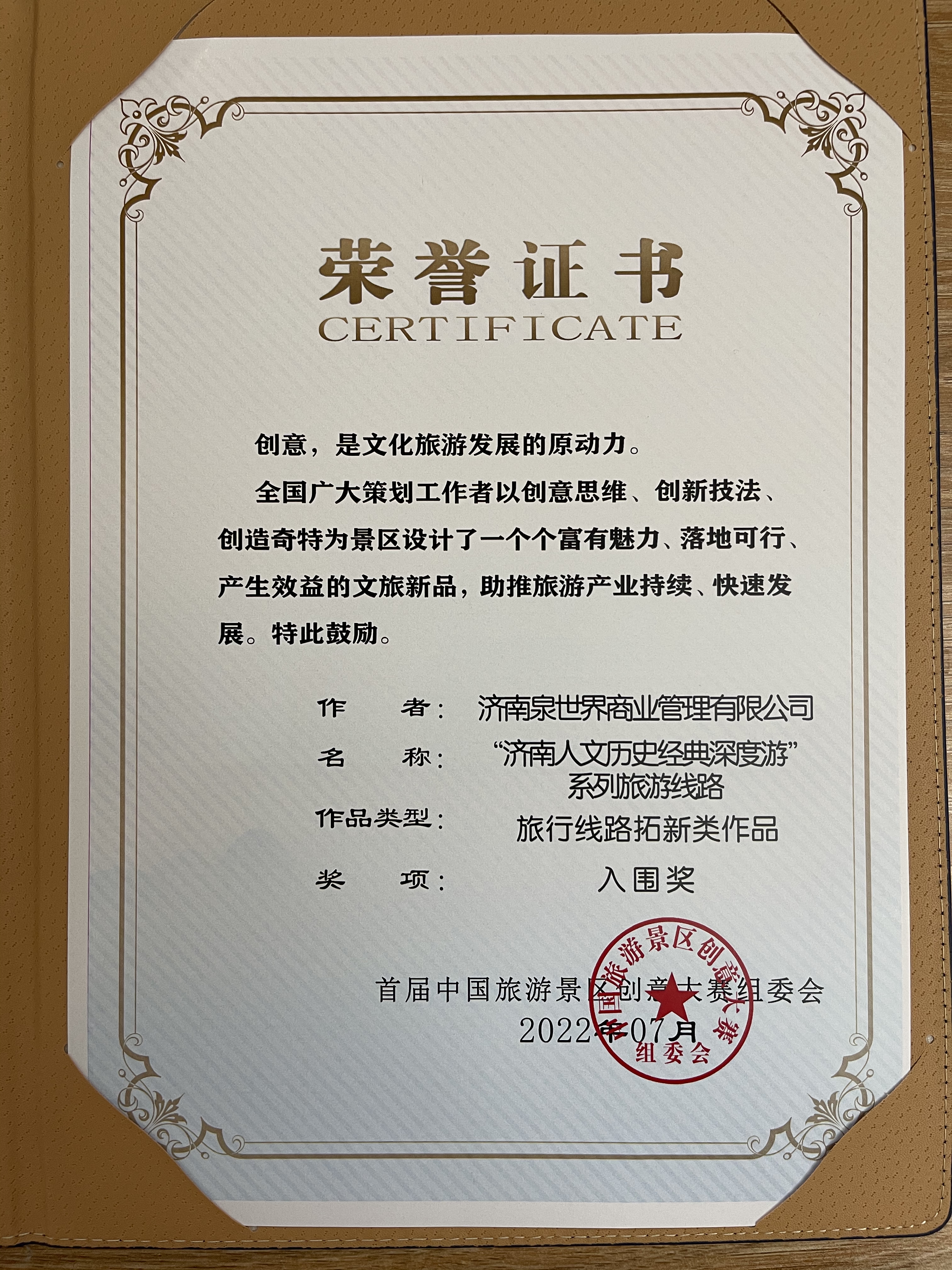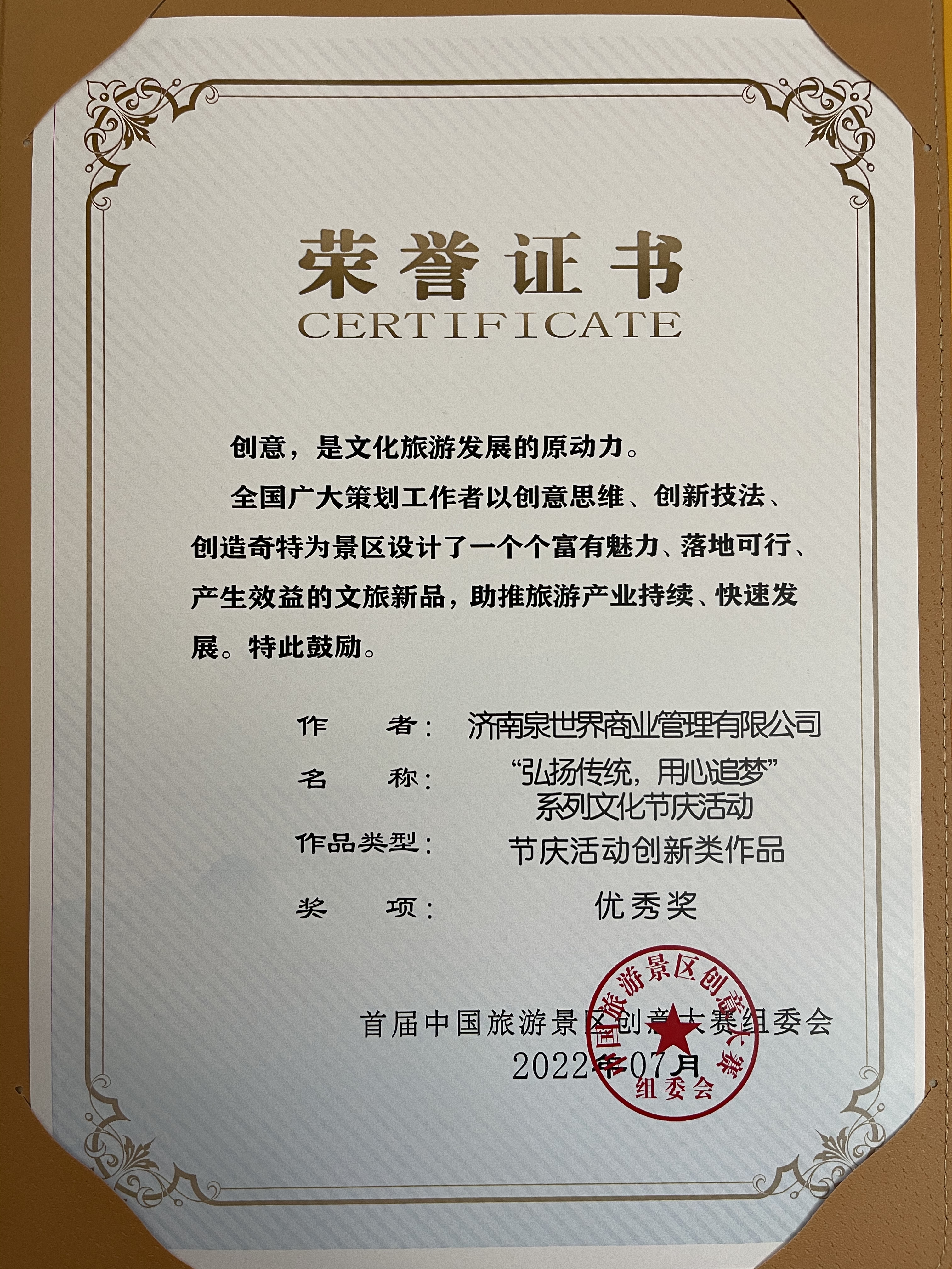 為推動(dòng)文旅產(chǎn)業(yè)提標(biāo)提效發(fā)展,豐富文化內(nèi)涵,激發(fā)創(chuàng)意思維,增強(qiáng)旅游市場(chǎng)活力,近日,由中國(guó)旅游景區(qū)協(xié)會(huì)主辦的首屆中國(guó)旅游景區(qū)創(chuàng)意大賽頒獎(jiǎng)典禮暨創(chuàng)意論壇在白音哈達(dá)旅游度假區(qū)舉辦。濟(jì)南泉世界商業(yè)管理有限公司運(yùn)營(yíng)管理的印象濟(jì)南·泉世界景區(qū),正在積極創(chuàng)建國(guó)家4A級(jí)旅游景區(qū),一直以來十分注重景區(qū)運(yùn)營(yíng)管理工作創(chuàng)新發(fā)展,組織了五項(xiàng)內(nèi)容參加了此次創(chuàng)意大賽,與全國(guó)各大知名旅游景區(qū)提交的200多份創(chuàng)意作品進(jìn)行角逐,最終有四份創(chuàng)意作品獲獎(jiǎng)。其中:《節(jié)慶活動(dòng)創(chuàng)新類作品》《營(yíng)銷模式開發(fā)類作品》獲得優(yōu)秀獎(jiǎng),《導(dǎo)游說景文編類作品》《旅游線路拓新類作品》獲得入圍獎(jiǎng)。