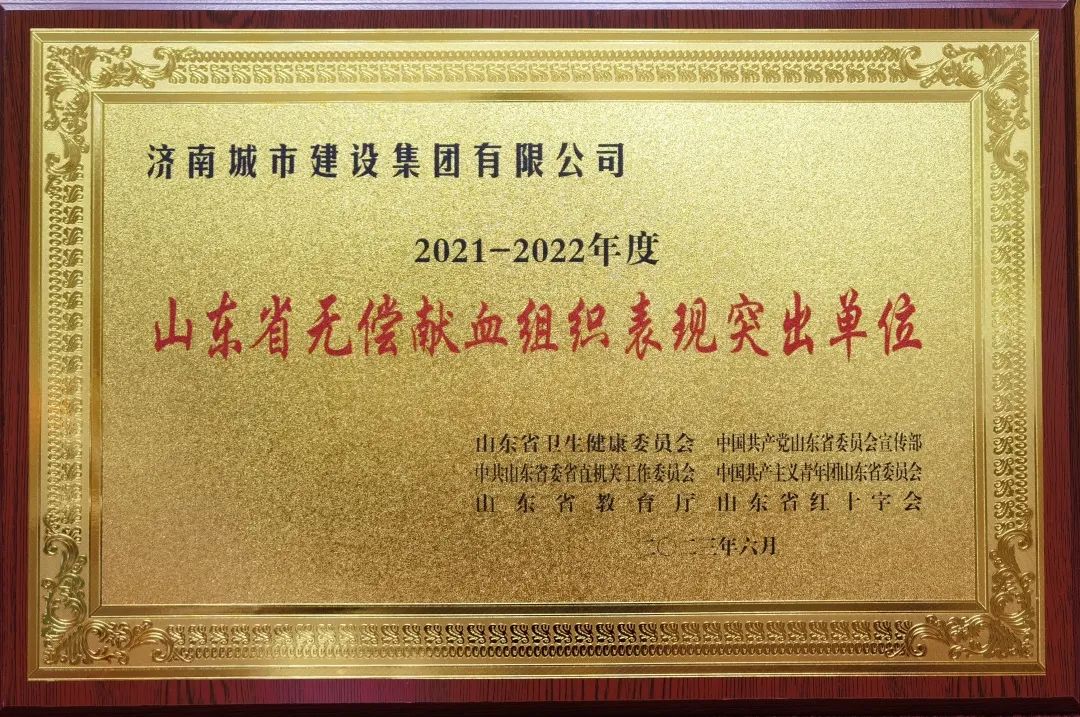 6月14日,值第二十個“世界獻血者日”,山東省衛(wèi)生健康委在濟南舉行山東省2023年世界獻血者日宣傳活動,對榮獲全國無償獻血表彰和全省無償獻血表揚的集體和個人頒發(fā)獎牌和證書,濟南城市建設集團榮獲“山東省無償獻血組織表現突出單位”榮譽稱號。