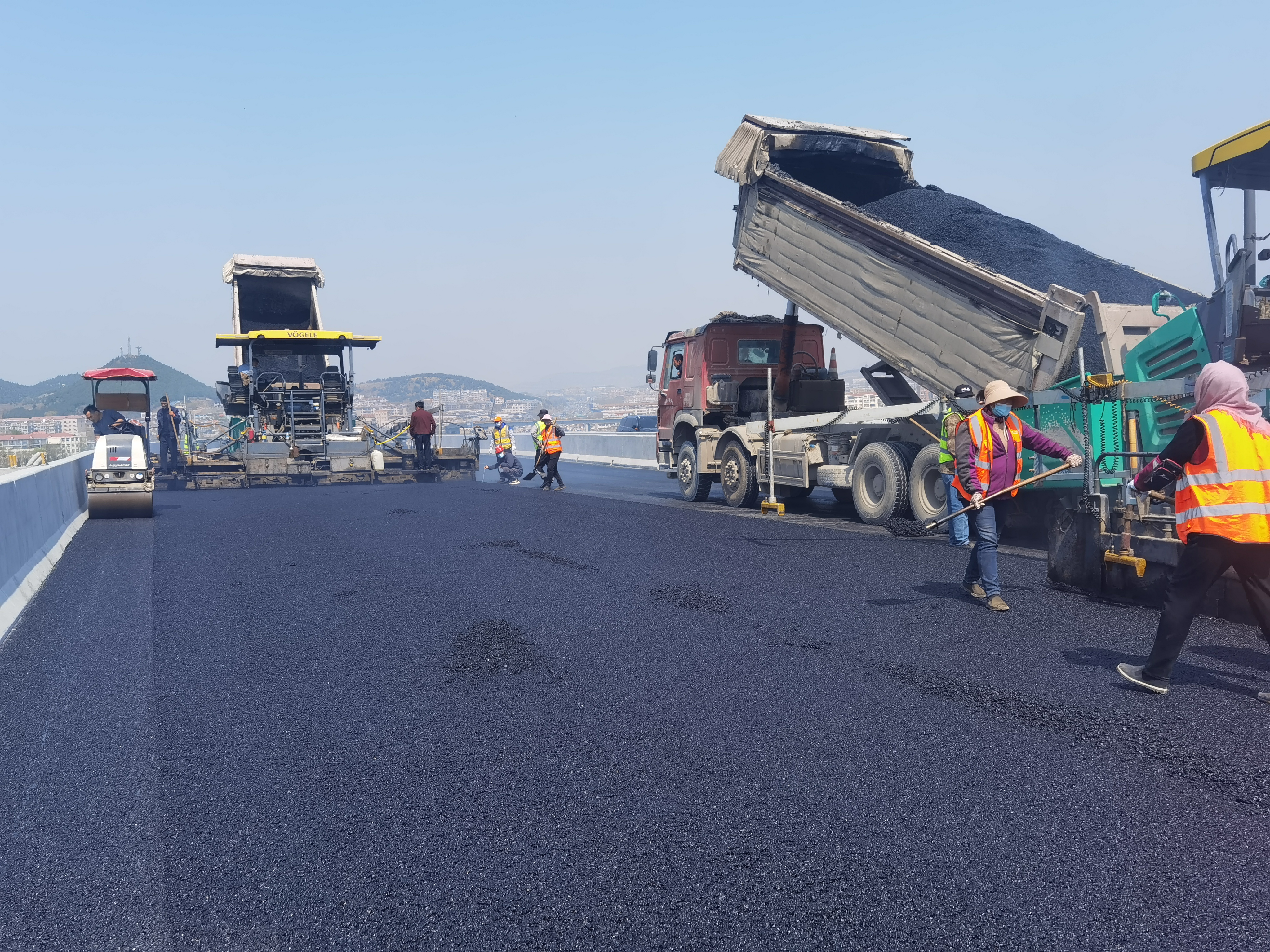 整個面層瀝青攤鋪采用“四機連鋪”、24小時連續(xù)攤鋪作業(yè)。項目2套瀝青拌合站24小時“火力全開”,人力、物力投入的“翻倍數(shù)”和路面攤鋪施工“三班倒”,跑出了工程建設(shè)“加速度”。