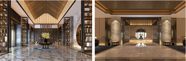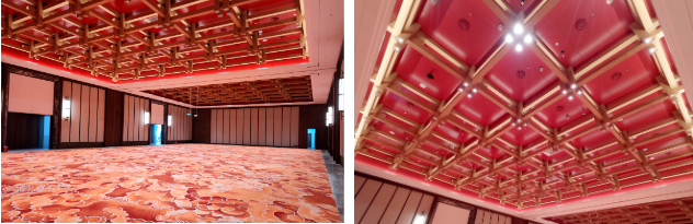 宴會廳天花的設計借鑒宋式屋架結構,通過現(xiàn)代設計手法進行簡化概括形成符合現(xiàn)代人審美的造型裝置藝術。
