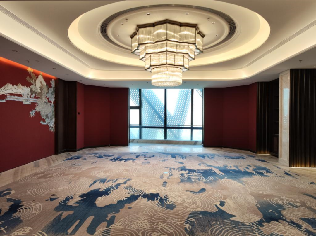 酒店大堂和過廳吊頂為異型鋁型材格柵吊頂,大宴會廳吊頂為多層鋁方通交錯布置造型,項目團隊使用BIM建模技術,優(yōu)化施工工藝提高了施工效率,僅此一項節(jié)省工期30天,項目團隊群策群力科學組織各項施工,7天完成地毯鋪裝18000平方米,10天完成墻面硬包安裝20000平方米,40天完成大理石鋪貼和干掛施工3.4萬平方米,項目如期通過驗收,為酒店開業(yè)奠定堅實的基礎。