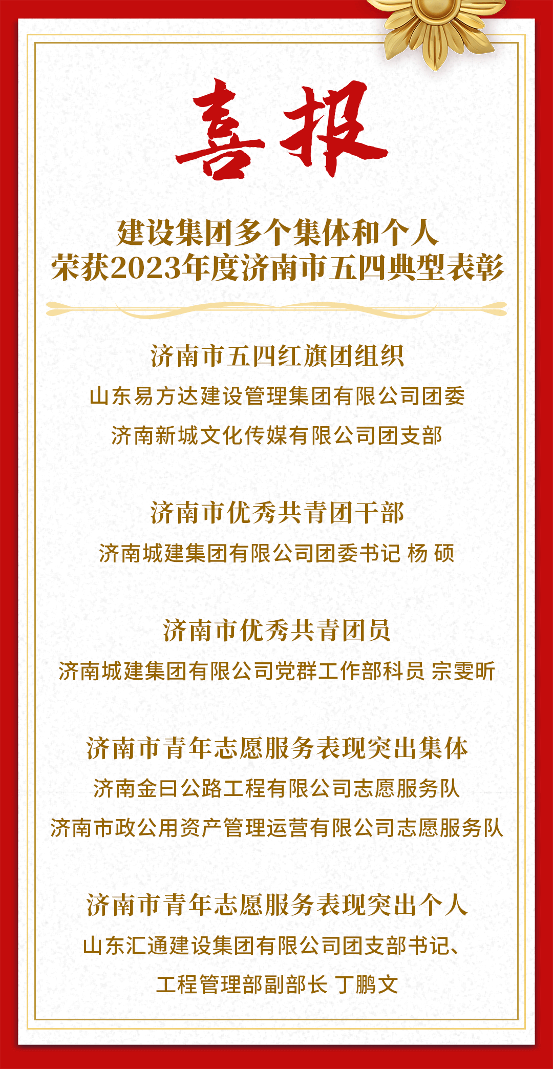 近日,共青團(tuán)濟(jì)南市委發(fā)布《關(guān)于2023年度濟(jì)南市五四典型的表揚(yáng)通報》,對“濟(jì)南市五四紅旗團(tuán)組織”“濟(jì)南市優(yōu)秀共青團(tuán)干部”“濟(jì)南市優(yōu)秀共青團(tuán)員”“濟(jì)南市青年志愿服務(wù)表現(xiàn)突出集體”“濟(jì)南市青年志愿服務(wù)表現(xiàn)突出個人”進(jìn)行通報表揚(yáng),濟(jì)南城市建設(shè)集團(tuán)榮獲多項榮譽(yù)稱號。
