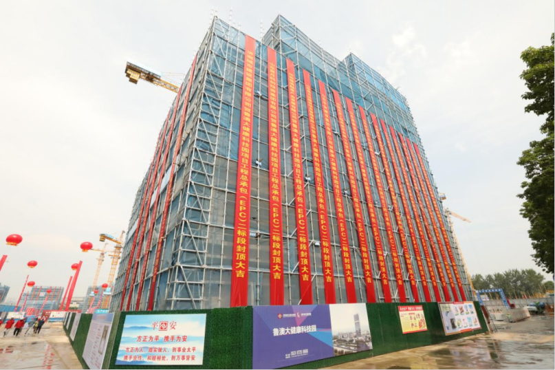 魯澳大健康科技園是山東省與澳門在中醫(yī)藥領(lǐng)域合作的核心平臺,由濟(jì)南市、山東中醫(yī)藥大學(xué)、澳門科技大學(xué)三方聯(lián)手打造。項目位于長清區(qū)大學(xué)路,總建筑面積19.6萬㎡,是建設(shè)集團(tuán)產(chǎn)業(yè)園經(jīng)濟(jì)產(chǎn)業(yè)鏈?zhǔn)着椖?,由所屬山東貫月科創(chuàng)投資集團(tuán)投資建設(shè)。項目共分為兩個標(biāo)段,當(dāng)前封頂?shù)膶儆诙?biāo)段。