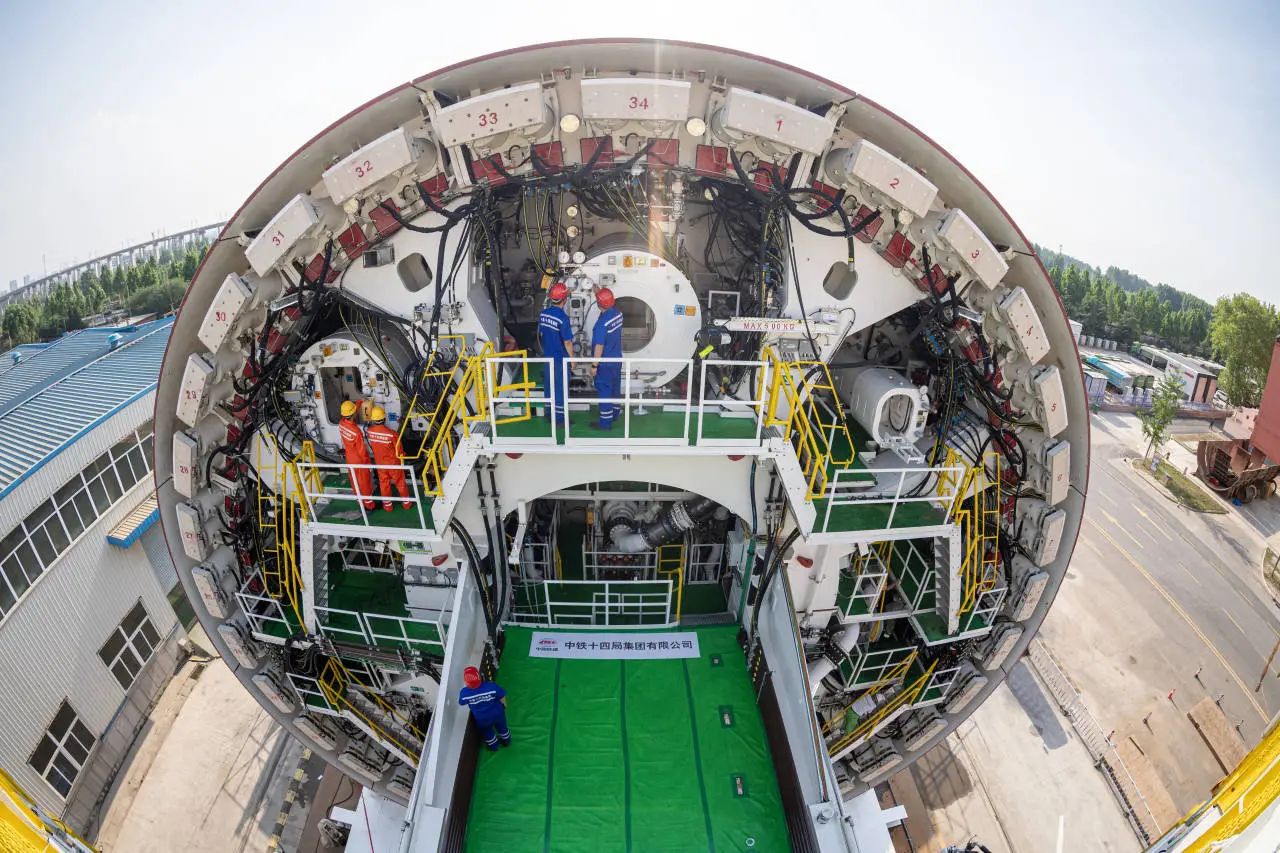 “山河號(hào)”泥水平衡盾構(gòu)機(jī)由濟(jì)南重工集團(tuán)、海瑞克集團(tuán)聯(lián)合濟(jì)南城市建設(shè)集團(tuán)、中鐵十四局集團(tuán)研發(fā)制造,最大開(kāi)挖直徑17.5米,盾構(gòu)機(jī)總長(zhǎng)163米、重約5200噸、裝機(jī)總功率12580千瓦;配備各類型開(kāi)挖刀具共計(jì)306把,其中57把具備滾齒互換功能,以優(yōu)化其在多變地層中的作業(yè)性能;裝配帶壓復(fù)合型刀盤、伸縮式主驅(qū)動(dòng)、泥水倉(cāng)伸縮攝像頭;搭載刀盤磨損自動(dòng)監(jiān)測(cè)、設(shè)備狀態(tài)在線監(jiān)測(cè)和“五官一腦”智能化裝備系統(tǒng),并通過(guò)大盾構(gòu)云智慧平臺(tái)實(shí)現(xiàn)遠(yuǎn)程操控,以保證掘進(jìn)安全和效率。