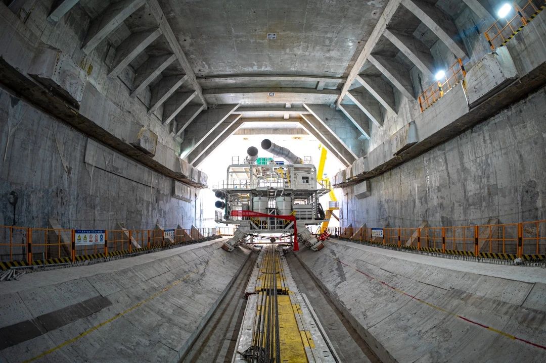 目前,“山河號”盾構機一號臺車已下井,重510噸,長約30米,是“山河號”盾構機后配套臺車中最大、最關鍵的一節(jié)。整個后配套臺車為三層框架結構,搭載盾構機掘進的主要設備,配置有盾構機駕駛室、供電設施、泥漿環(huán)流系統(tǒng)組件、液壓泵站組件和同步雙液注漿系統(tǒng)組件,吊裝施工以后、中、前的順序,由800噸履帶吊從始發(fā)井端頭依次吊裝下井進行組裝。