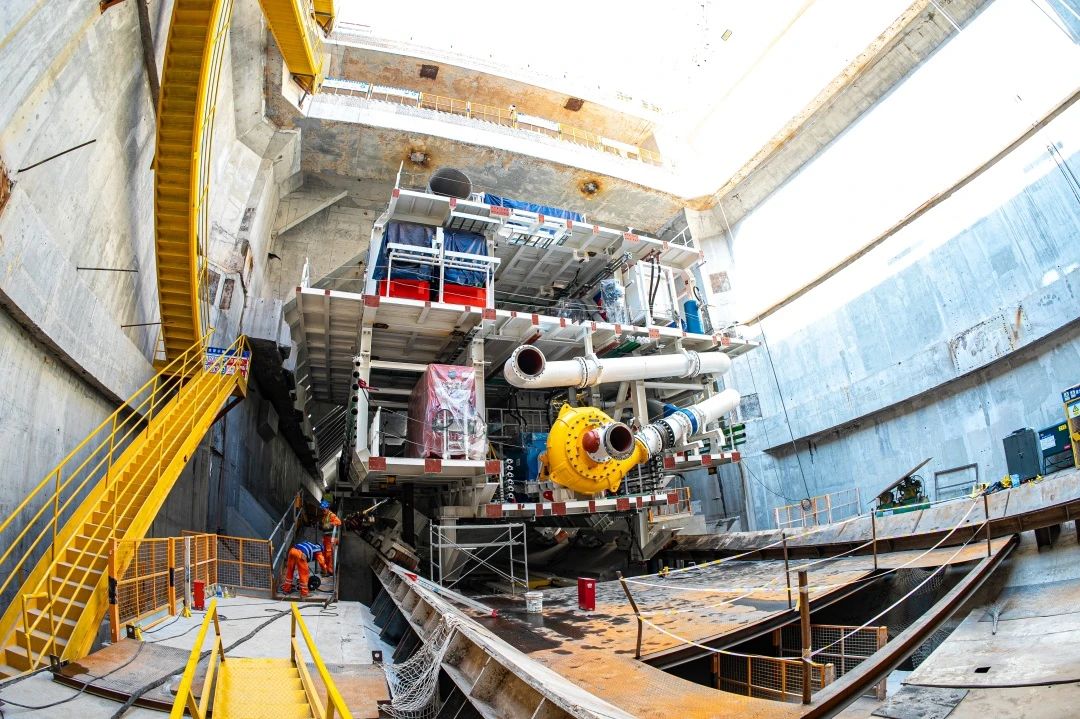 負責盾構施工的“山河號”泥水平衡盾構機,最大開挖直徑達17.5米,相當于6層樓的高度,盾構機總長163米、重5200噸、裝機總功率12580千瓦。