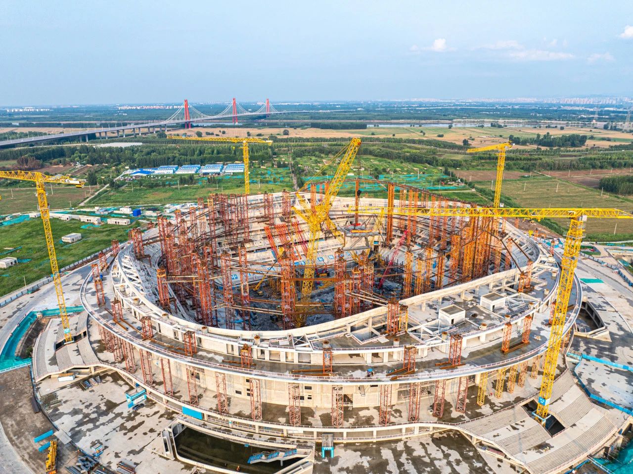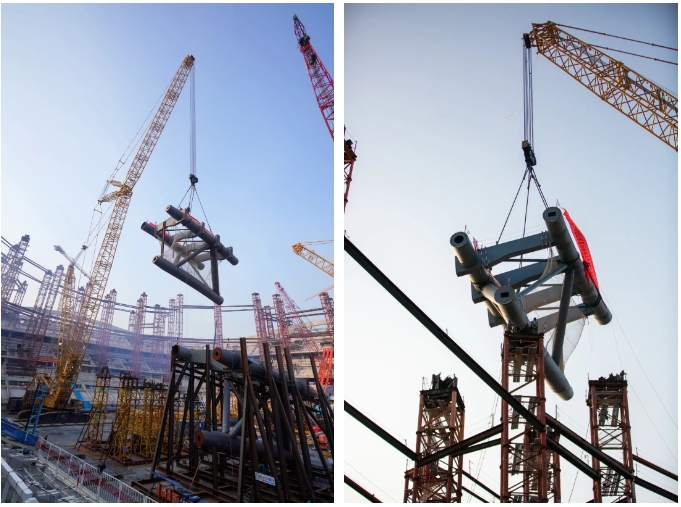 本次實施的首次吊裝段,位于內(nèi)環(huán)桁架,單元吊重達(dá)168噸,起吊縱深高達(dá)60余米。項目位于濟南新舊動能轉(zhuǎn)換起步區(qū),建筑面積19.73萬平方米,建筑高度為60米,是山東省首個6萬座專業(yè)足球場,可承辦國際、國內(nèi)重大體育賽事。同時也是國內(nèi)體育場館懸挑長度最大的工程,最大懸挑長度達(dá)到了45米,屋蓋鋼結(jié)構(gòu)由星形拱桁架、內(nèi)環(huán)桁架、外環(huán)桁架、單層網(wǎng)格及挑檐組成,總鋼量約3.1萬噸,靠36根排架柱支撐,形成巨型無柱大懸挑空間,在整體結(jié)構(gòu)中起到了承上啟下作用,下方排架柱與混凝土結(jié)構(gòu)相連,上方支撐索結(jié)構(gòu)、膜結(jié)構(gòu)。項目預(yù)計在2026年底竣工驗收完成。