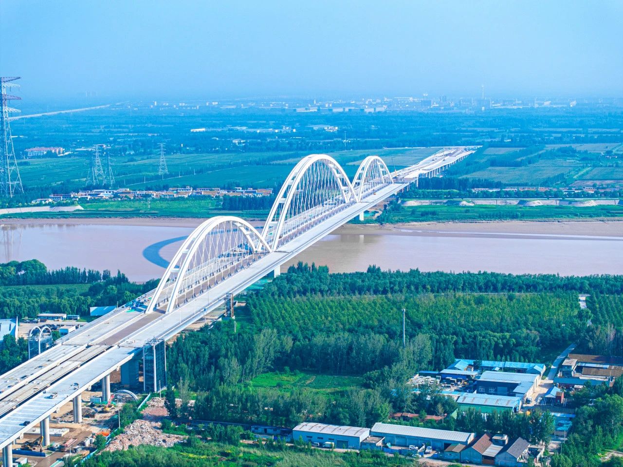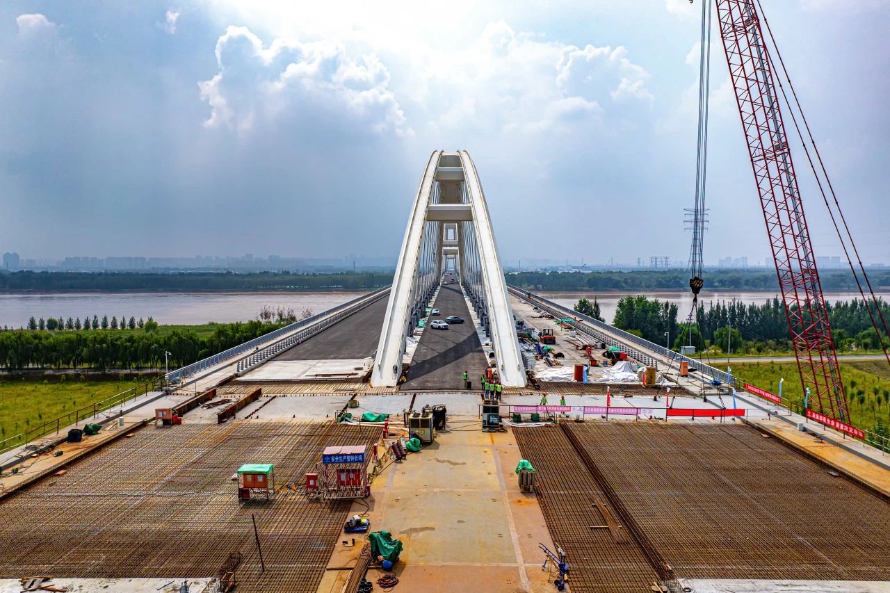 濟南黃河齊魯大橋為黃河之上首座下承式網狀系桿拱橋,主跨徑達420米、寬60.7m,創(chuàng)世界同類型橋梁最大跨徑、最大梁寬,其400Mpa超高應力幅拉索在橋梁建設領域首次研發(fā)應用。
