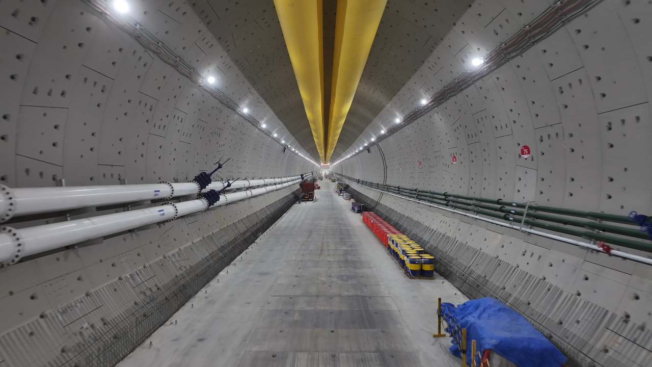 濟南市黃崗路穿黃隧道是濟南踐行“黃河流域生態(tài)保護和高質量發(fā)展”國家戰(zhàn)略的標桿性工程,工程南起藍翔中路,終點與在建G309互通立交相銜接,雙向6車道,設計時速60公里,全長約5755米,采用特大直徑盾構形式穿越黃河懸河段,其中盾構段長3290米,管片外徑為16.8米,盾構機開挖直徑17.5米,開挖斷面面積達240平方米,是世界最大直徑水下盾構隧道。
