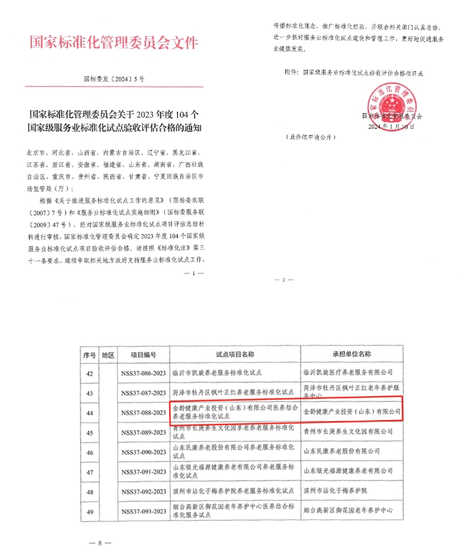 近日,根據(jù)《關于推進服務標準化試點工作的意見》(國標委農聯(lián)[2007]7號)和《服務業(yè)標準化試點實施細則》(國標委服務聯(lián)[2009]47號),經對國家級服務業(yè)標準化試點項目評估總結材料進行審核,國家標準化管理委員會確定2023年度104個國家級服務業(yè)標準化試點項目驗收評估合格,建設集團所屬金齡健康產業(yè)投資(山東)有限公司醫(yī)養(yǎng)結合養(yǎng)老服務標準化試點通過驗收。