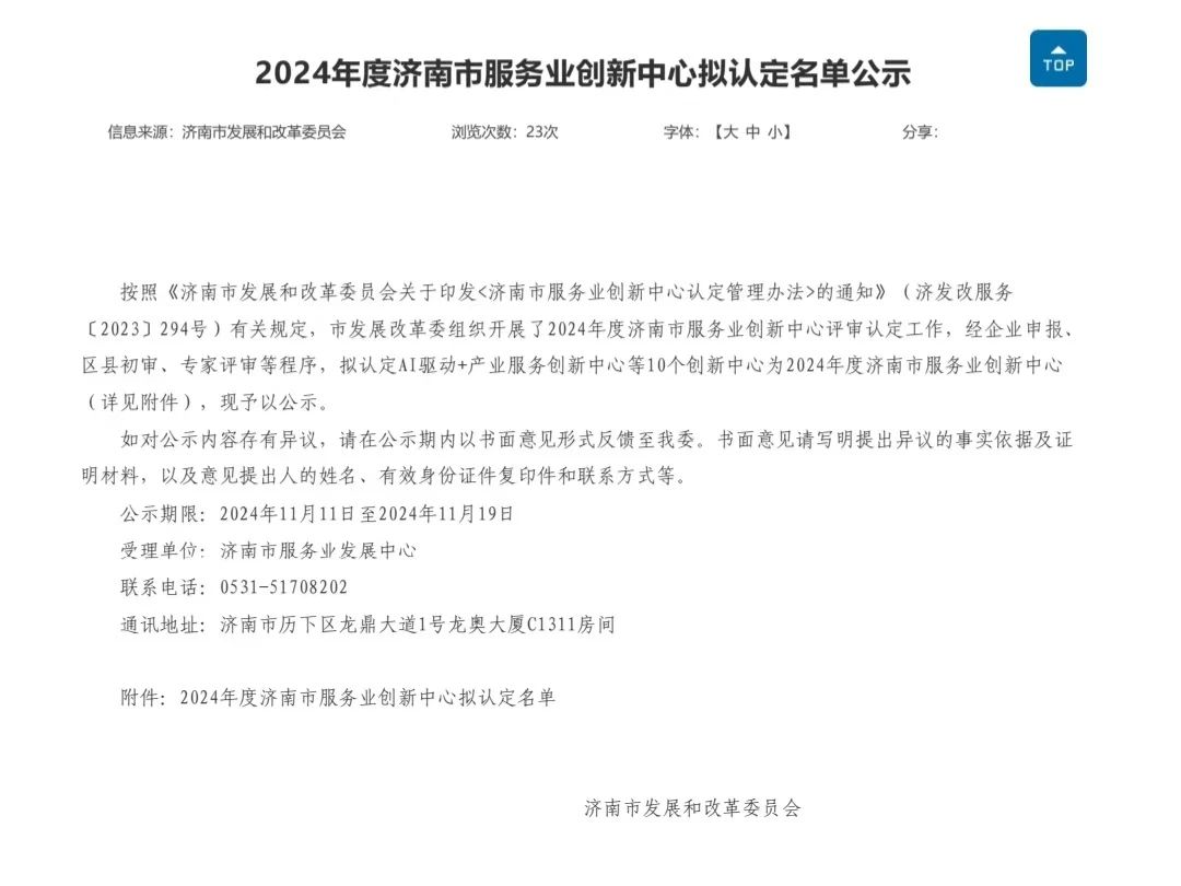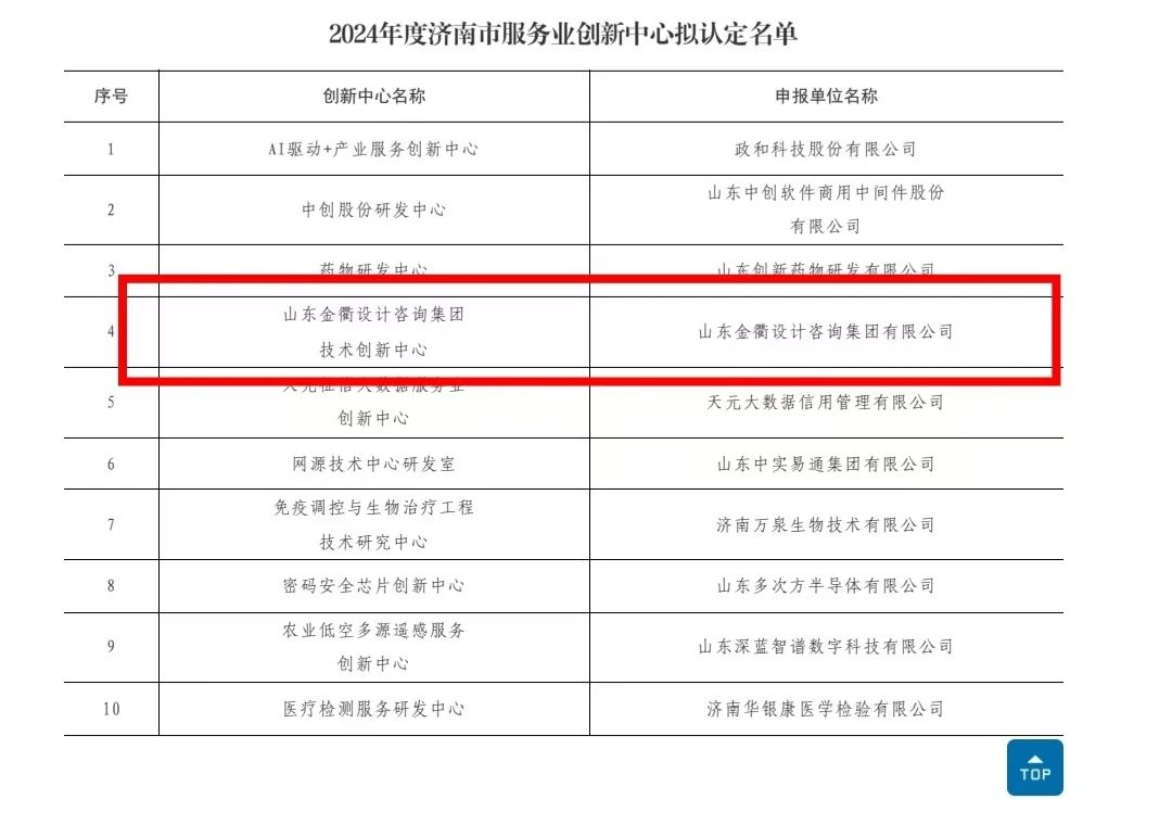 近日,濟(jì)南市發(fā)展和改革委員會公示《2024年度濟(jì)南市服務(wù)業(yè)創(chuàng)新中心擬認(rèn)定名單》,建設(shè)集團(tuán)所屬山東金衢設(shè)計咨詢集團(tuán)有限公司技術(shù)創(chuàng)新中心獲批2024年度濟(jì)南市服務(wù)業(yè)創(chuàng)新中心。