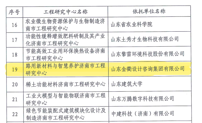 近日,濟(jì)南市發(fā)展和改革委員會(huì)下發(fā)《關(guān)于公布2024年度認(rèn)定濟(jì)南市工程研究中心名單的通知》,建設(shè)集團(tuán)所屬山東金衢設(shè)計(jì)集團(tuán)有限公司“路用新材料與智慧養(yǎng)護(hù)濟(jì)南市工程研究中心”(以下簡(jiǎn)稱工程研究中心)經(jīng)嚴(yán)格考察、評(píng)審和公示,成功入選,這是2024年金衢集團(tuán)公司繼濟(jì)南市重點(diǎn)實(shí)驗(yàn)室、專家工作站、服務(wù)業(yè)創(chuàng)新中心后獲批的又一科創(chuàng)平臺(tái)。