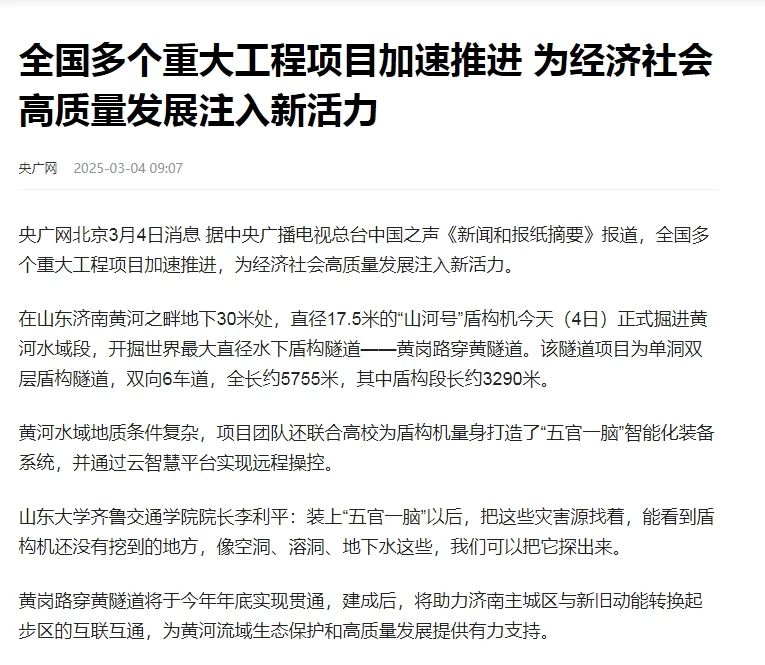 濟南廣電·叮咚FM客戶端3月4日訊 當前,濟南各重點項目搶抓春季施工“黃金季”,掀起如火如荼的施工熱潮。3月4日,中央廣播電視總臺中國之聲《新聞和報紙摘要》欄目聚焦各地重點工程建設(shè)加緊推進,為經(jīng)濟發(fā)展注入新動能,播發(fā)了由濟南新聞綜合廣播記者協(xié)助完成的新聞,重點報道濟南黃崗路穿黃隧道項目建設(shè)進展和工程亮點。