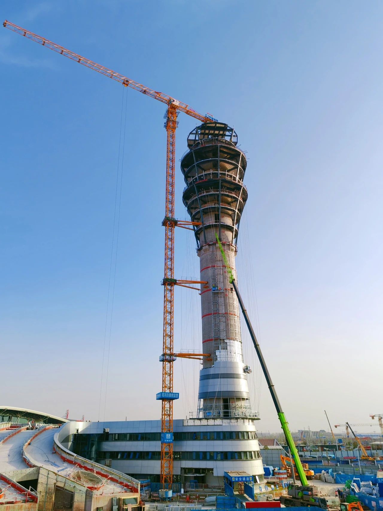 新建機(jī)場塔臺(tái)高度為99.5米,共19層,是國內(nèi)第一個(gè)具備三層指揮層的塔臺(tái)。其中19層為指揮層,可俯瞰整座機(jī)場范圍,17層和16層是機(jī)坪指揮以及空管的應(yīng)急指揮層。項(xiàng)目于2024年1月10日開工,2024年4月30日完成土方開挖,2024年6月5日完成結(jié)構(gòu)正負(fù)零,2025年1月21日塔臺(tái)核心筒封頂,2025年3月19日完成筒外鋼結(jié)構(gòu)吊裝。