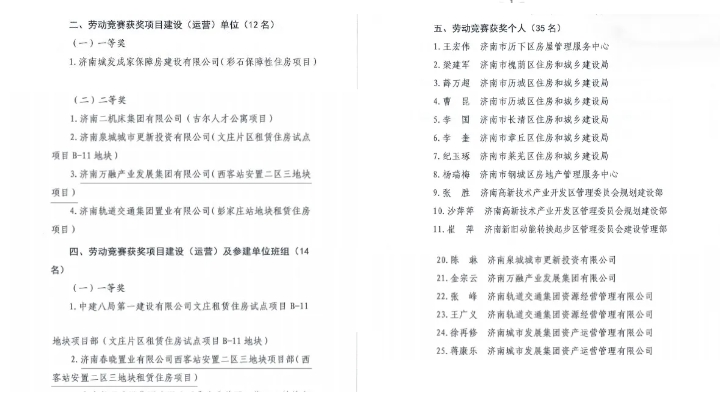 近日,濟(jì)南市住建局、市總工會(huì)公布2024年保障房建功立業(yè)創(chuàng)新創(chuàng)優(yōu)勞動(dòng)競(jìng)賽結(jié)果的通知,建設(shè)集團(tuán)所屬濟(jì)南萬(wàn)融產(chǎn)業(yè)發(fā)展集團(tuán)有限公司榮獲項(xiàng)目建設(shè)(運(yùn)營(yíng))單位二等獎(jiǎng)、公司職工金宗云獲評(píng)先進(jìn)個(gè)人,萬(wàn)融集團(tuán)所屬濟(jì)南春曉置業(yè)有限公司西客站安置二區(qū)三地塊項(xiàng)目部榮獲項(xiàng)目建設(shè)(運(yùn)營(yíng))及參建單位班組一等獎(jiǎng)。